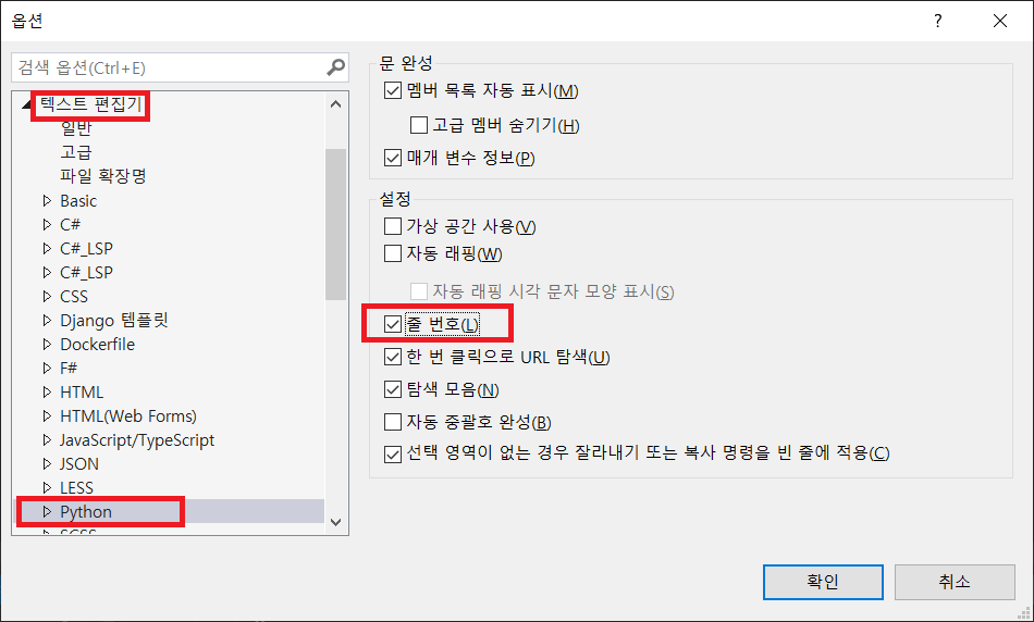 [텍스트 편집기] - [ Python ] - [ 줄 번호 ] 체크! - [ 확인 ]