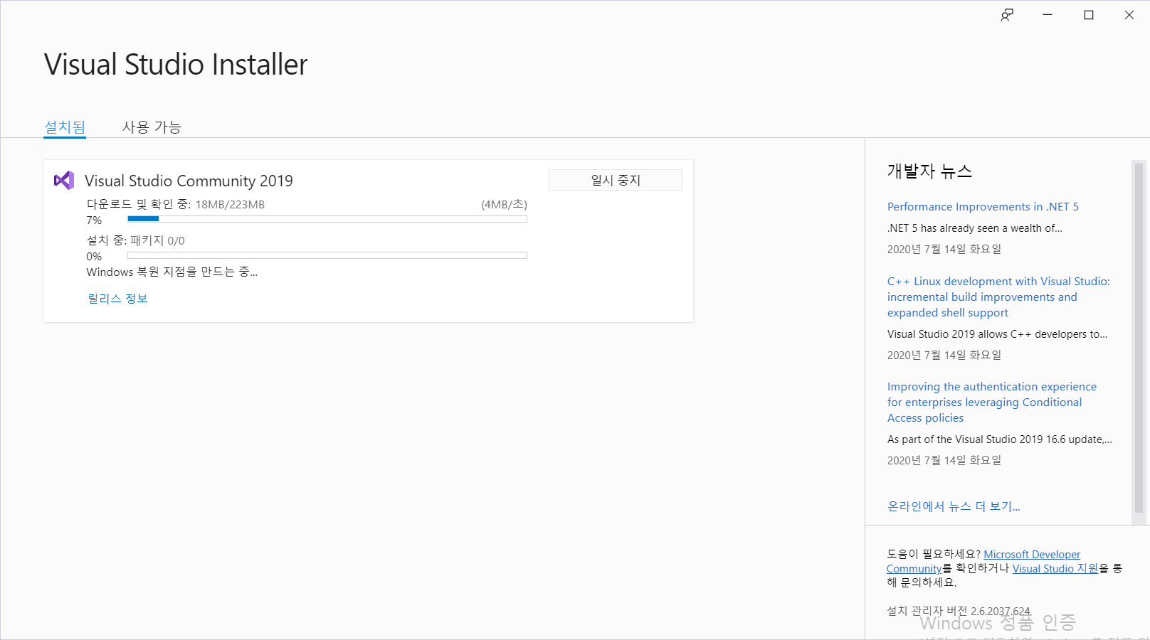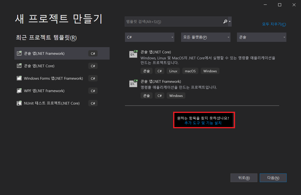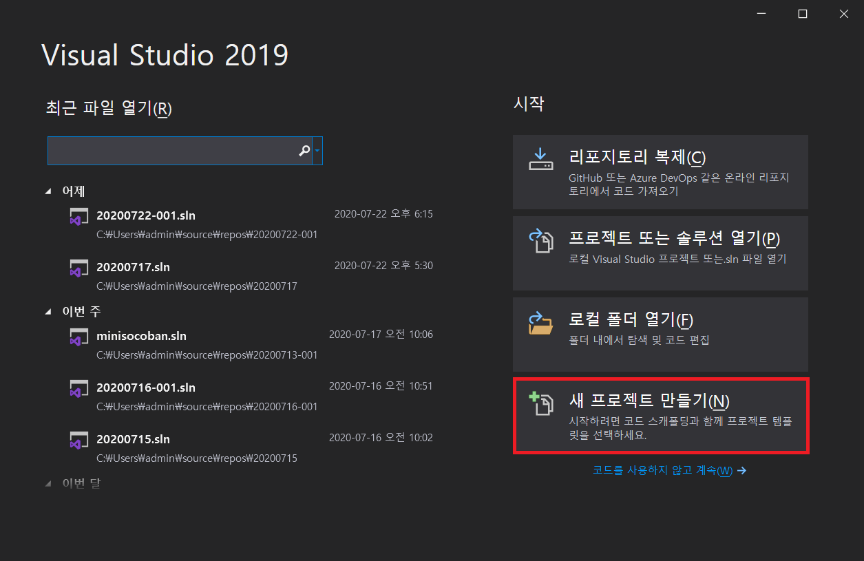 설치가 끝나고 완료가 됬다면 다시 Visual Studio를 실행해서 새 프로젝트를 만들어주세요!