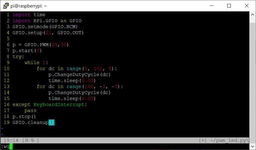 불이 천천히 켜지고 천천히 꺼지도록 설정한 코드입니다.