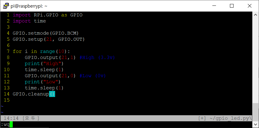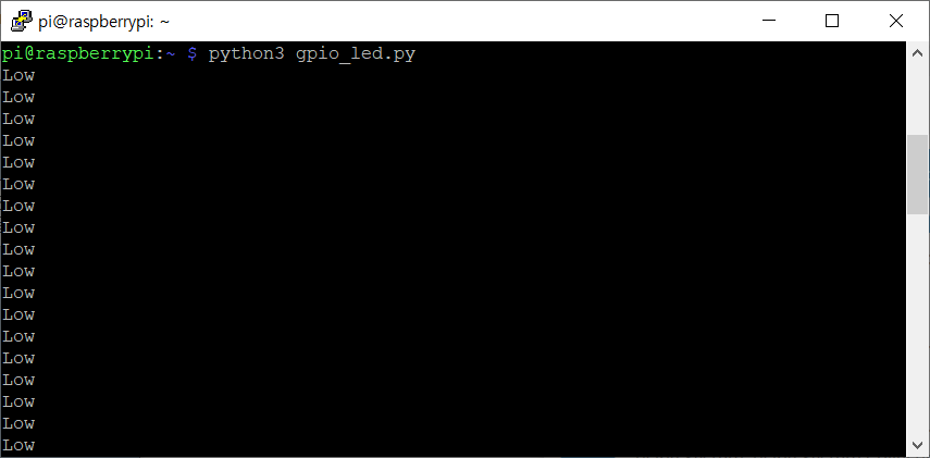 이제 Ground(GND)와 21번에 전도체같은 것으로 실험하였을 때 "Low"가 나오는 것을 확인할 수 있습니다.